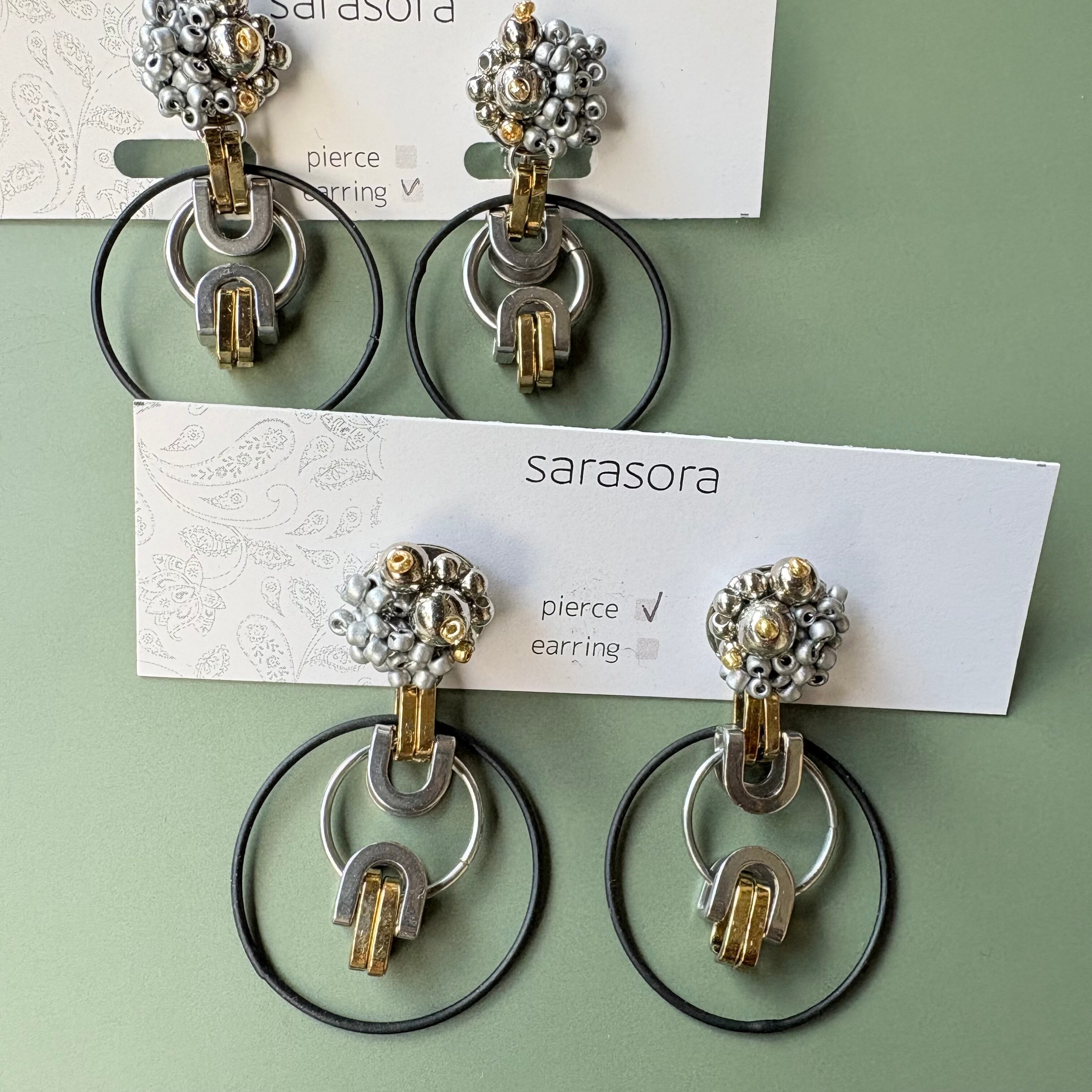 シルバーとゴールドのビーズを立体的に組み合わせ、そこから揺れるリングパーツをつなげました。