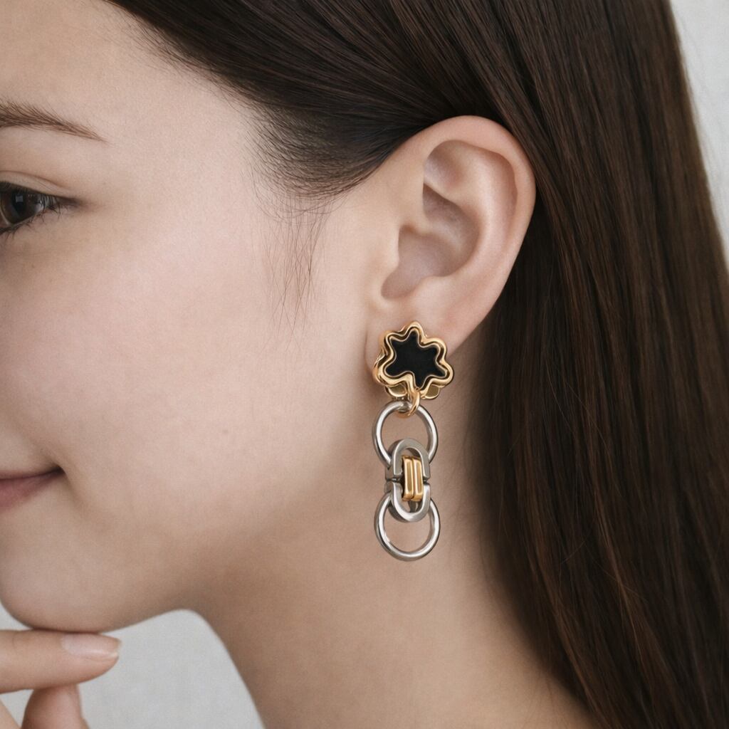 動くたびに揺れるリングパーツが光を反射して、顔まわりをぱっと明るく。