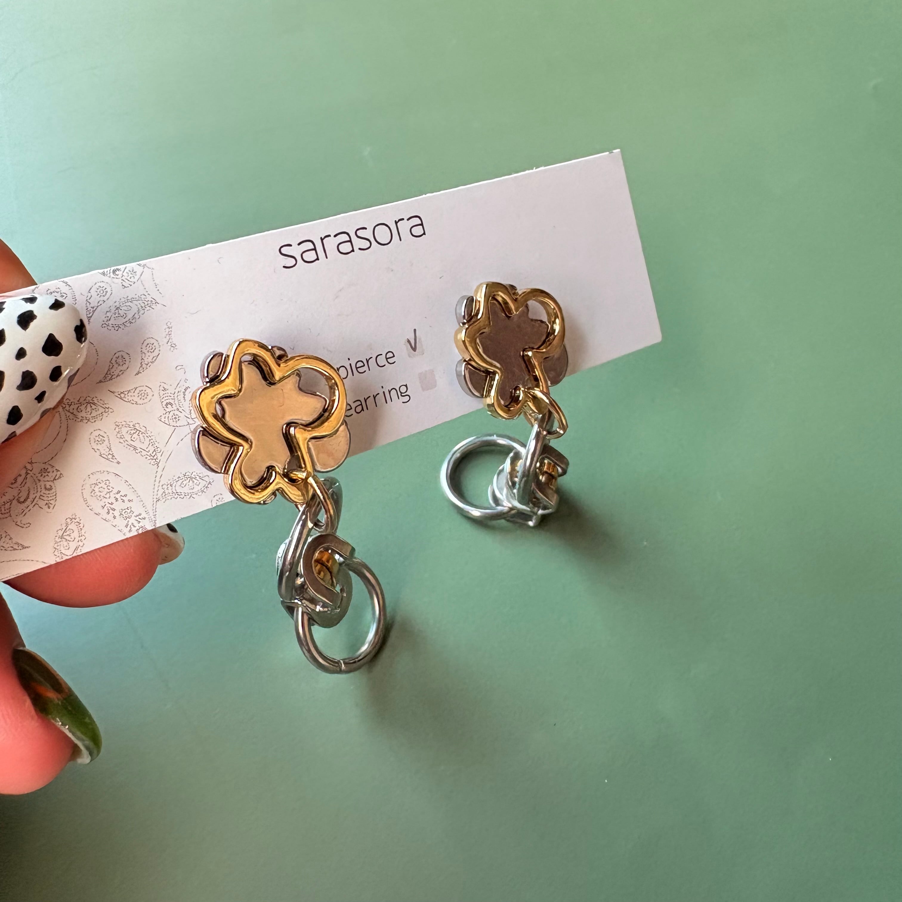 ころんとしたクローバーモチーフに、メタルリングを重ねた存在感のあるデザイン。