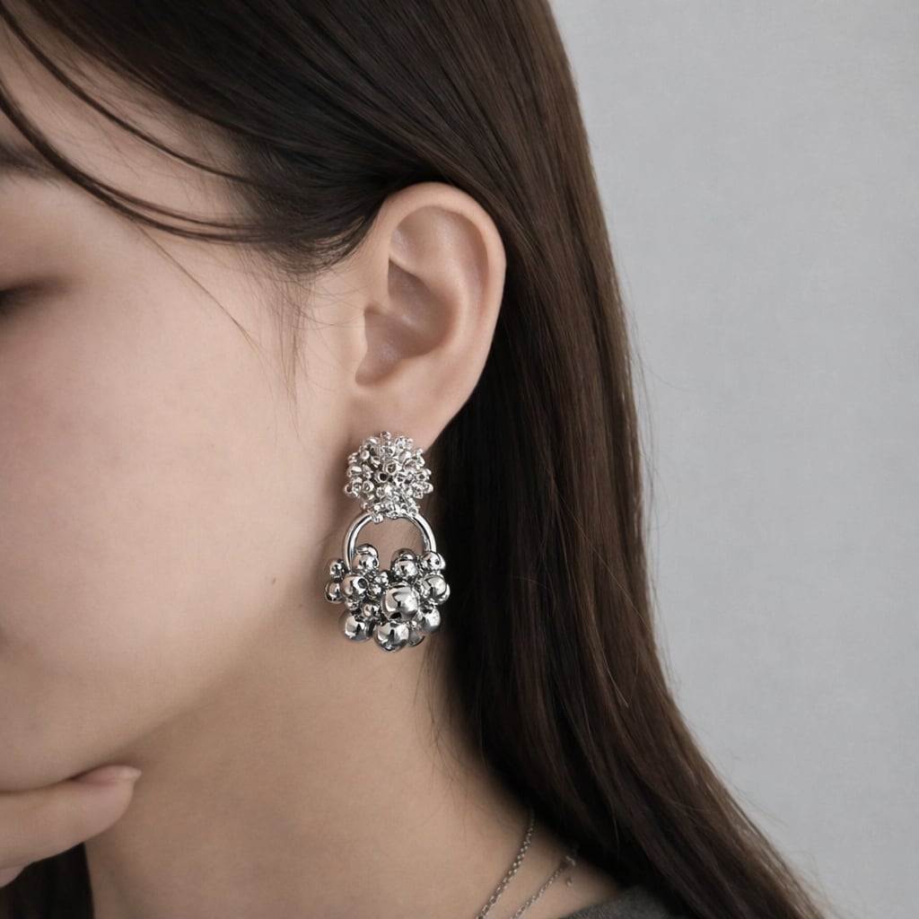 光を受けるたびにきらっと反射するメタリックビーズが、シンプルなコーデにも、少しモードな装いにも自然になじみます。