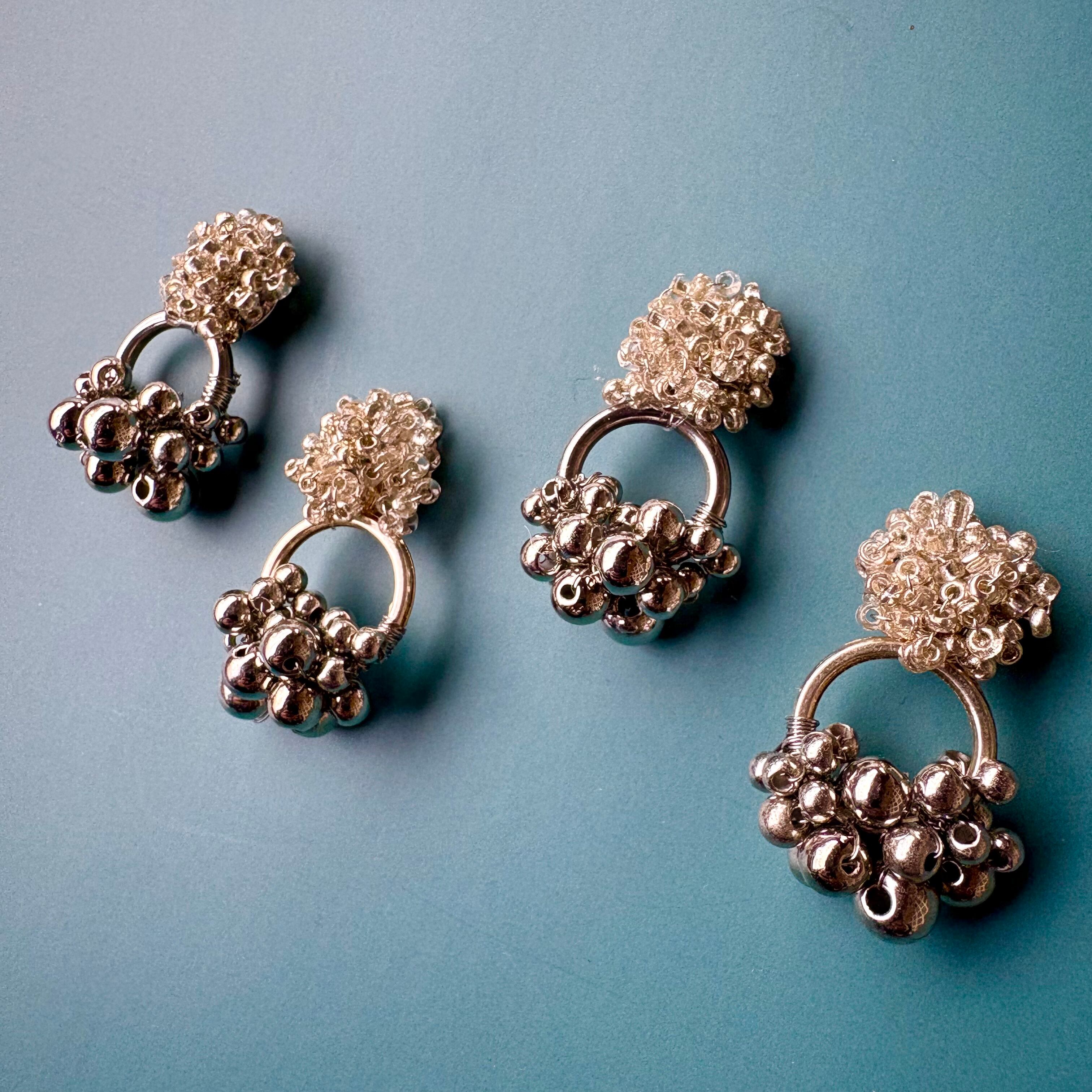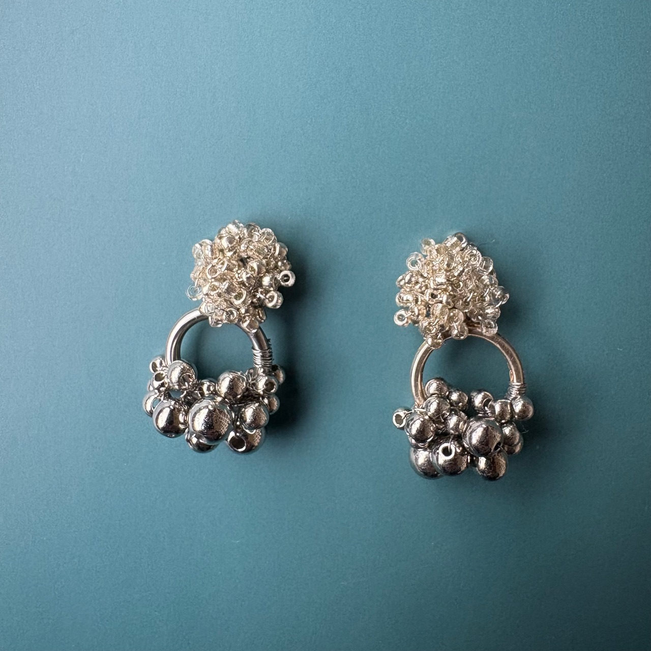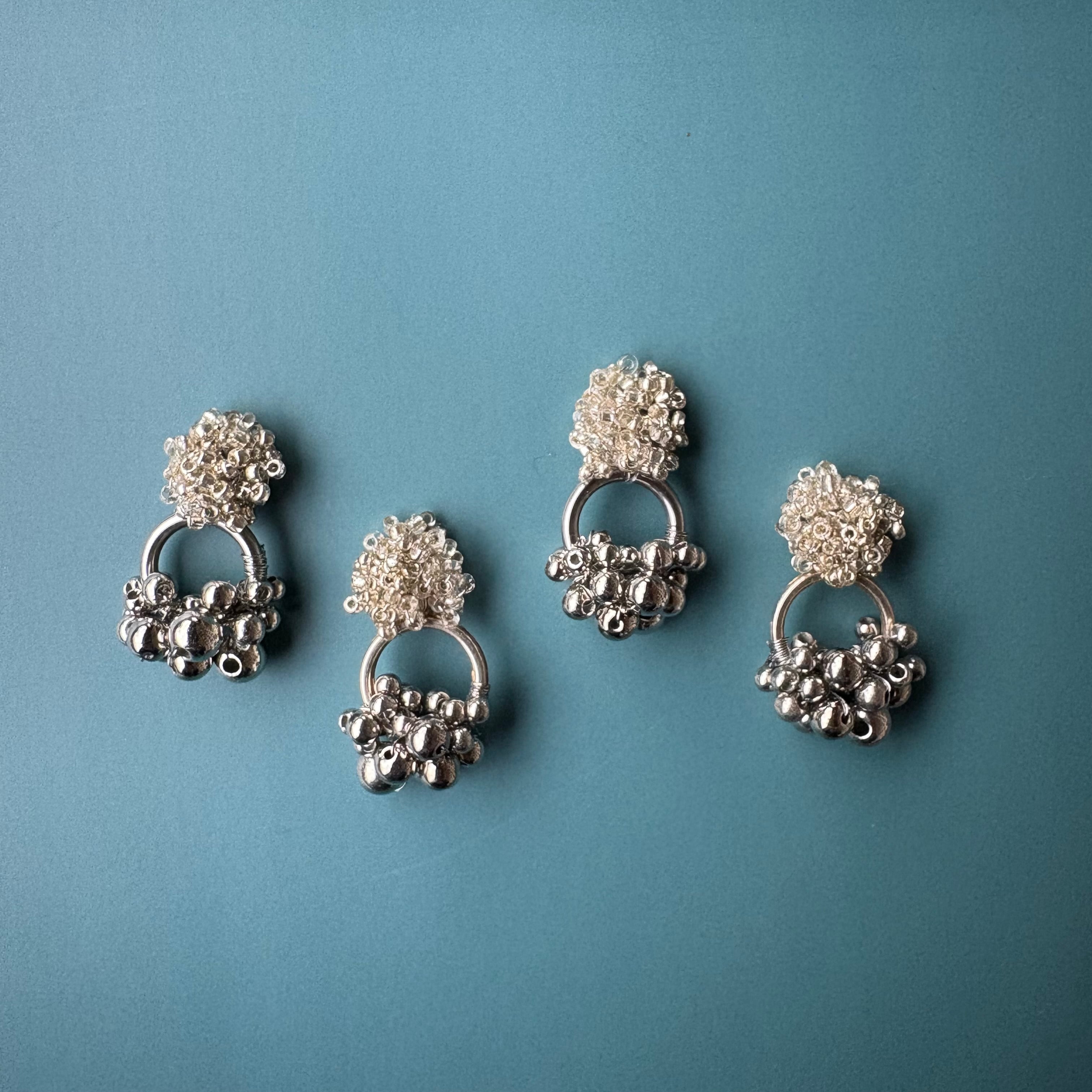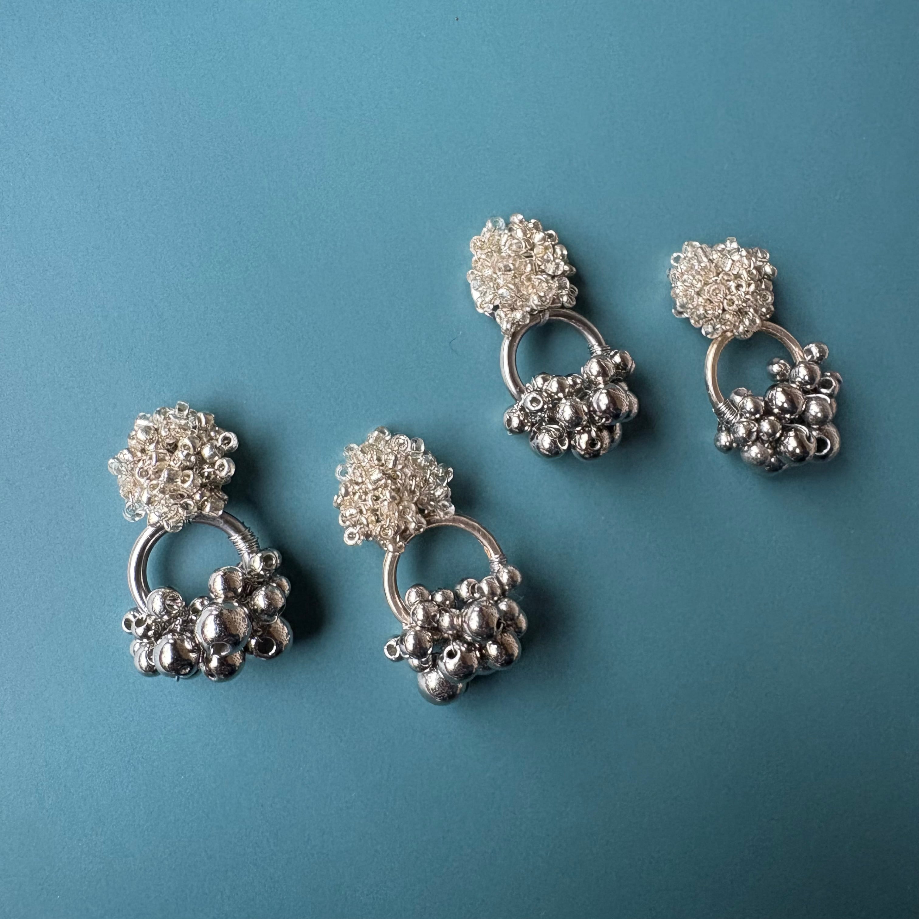 小さな粒をぎゅっと集めた、立体感のあるビーズモチーフにシルバーカラーのアクリルビーズを合わせた、上品で少し遊び心のあるピアスです。