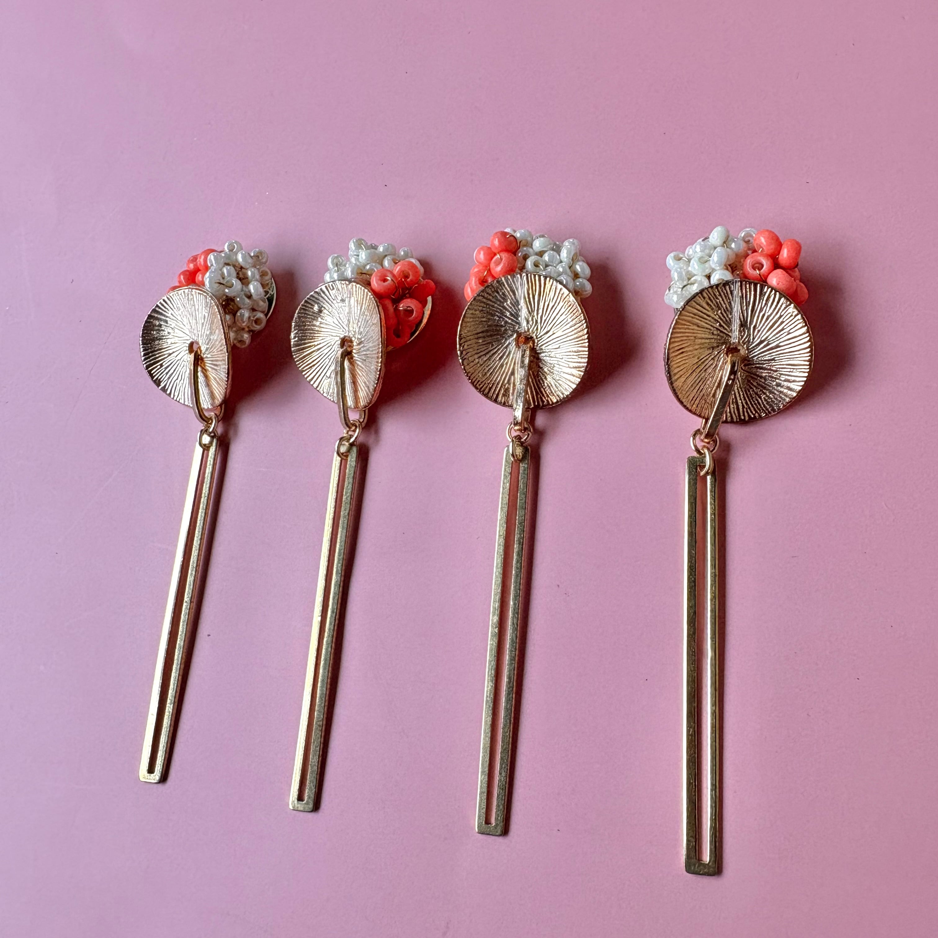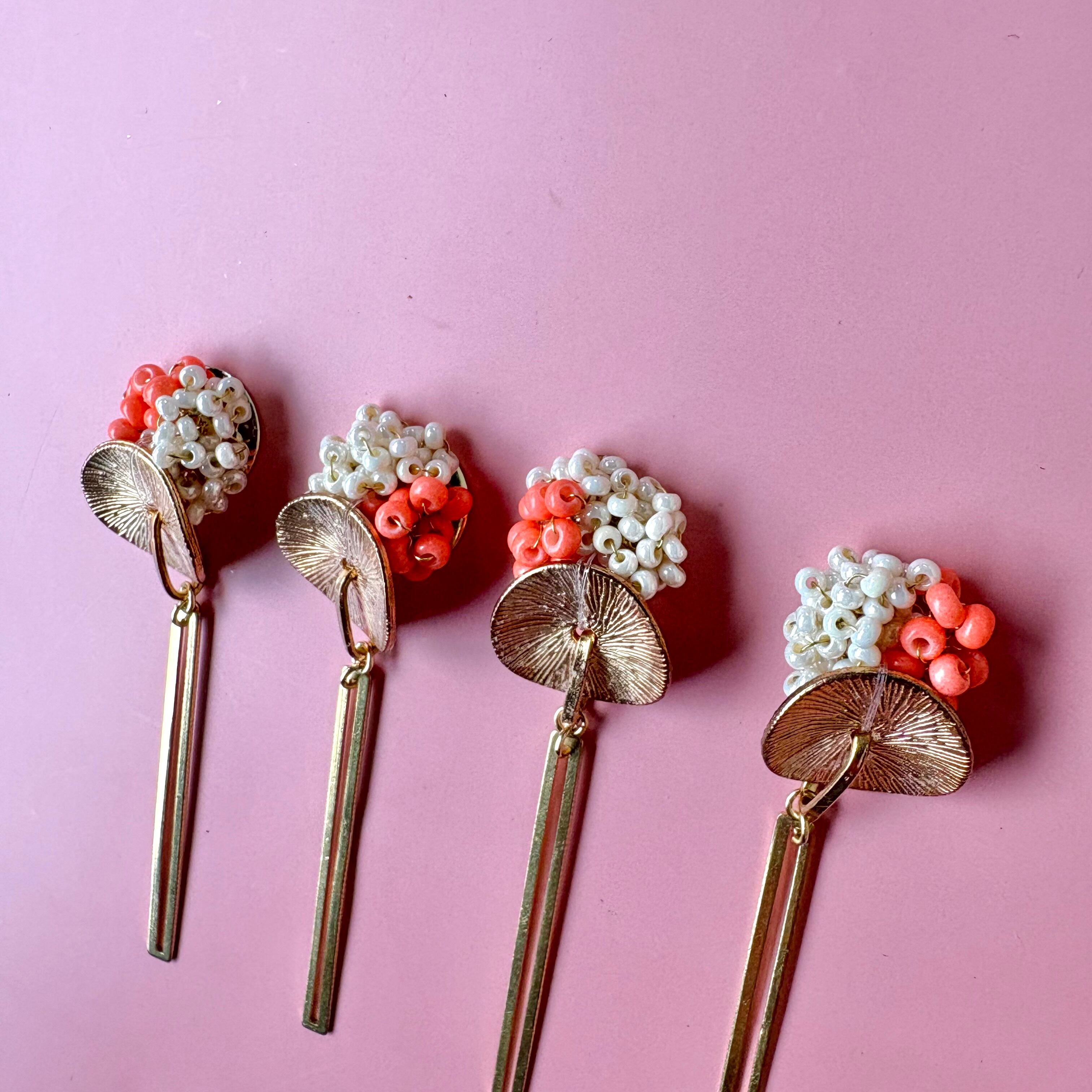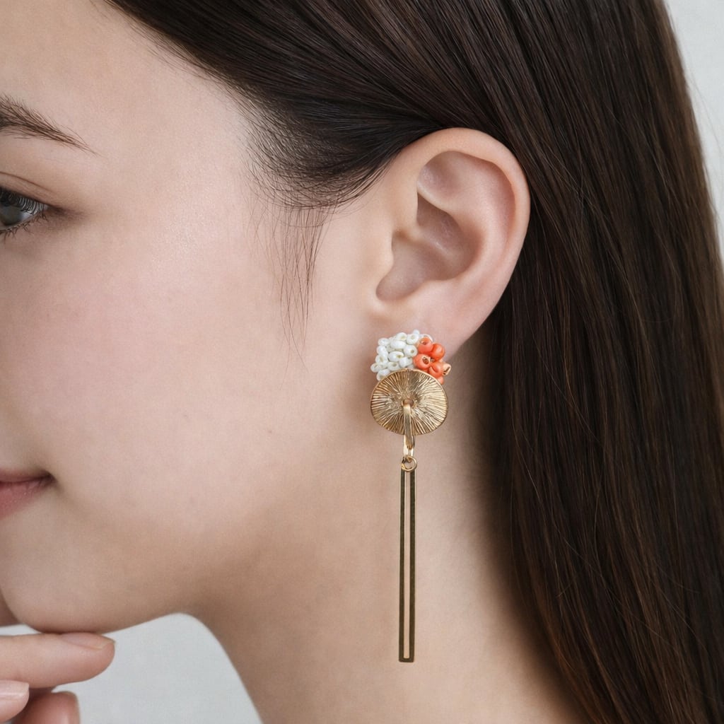 やわらかなコーラルとホワイトの粒に、きらりと光るゴールドパーツを合わせて、甘さと大人っぽさのバランスを大切に仕上げました。