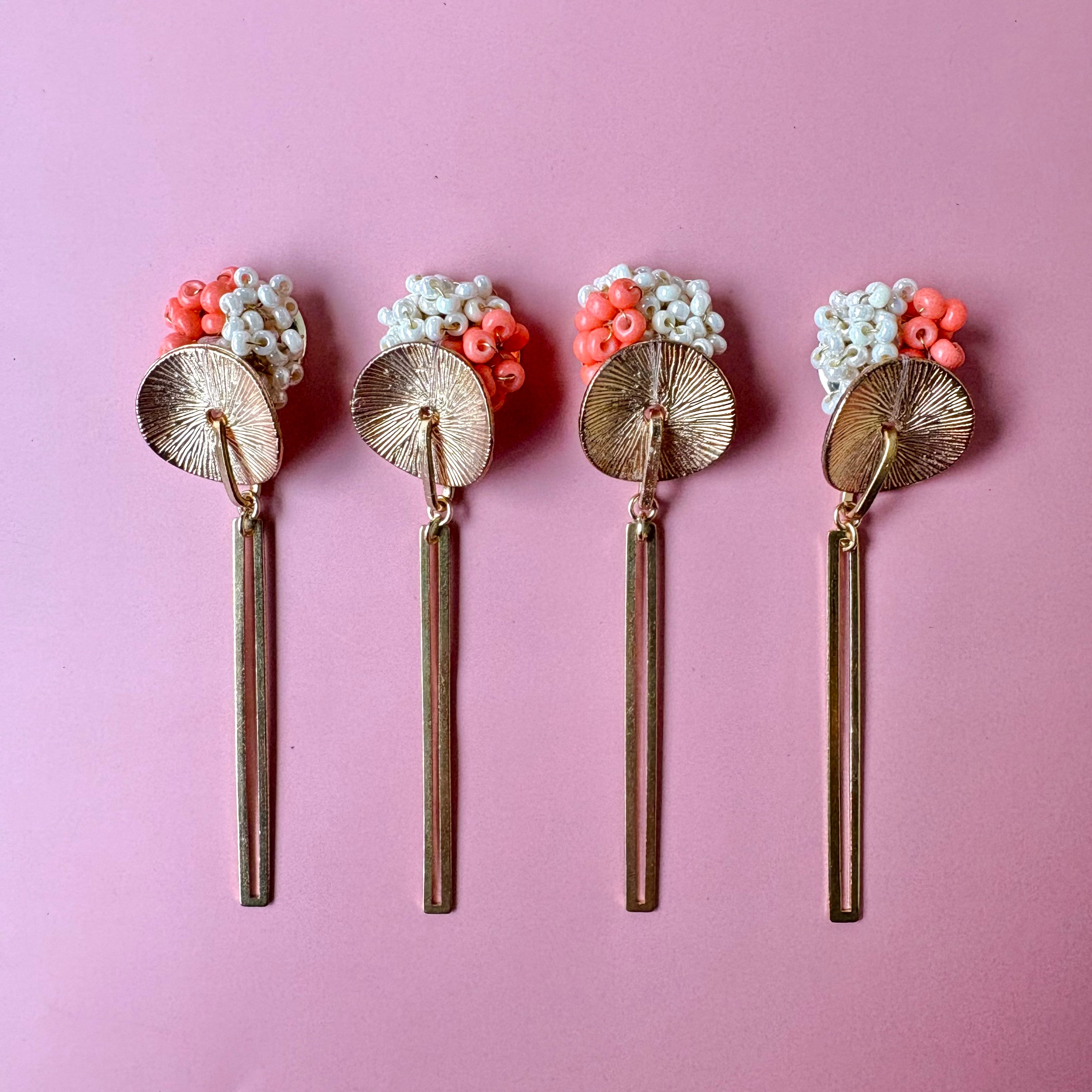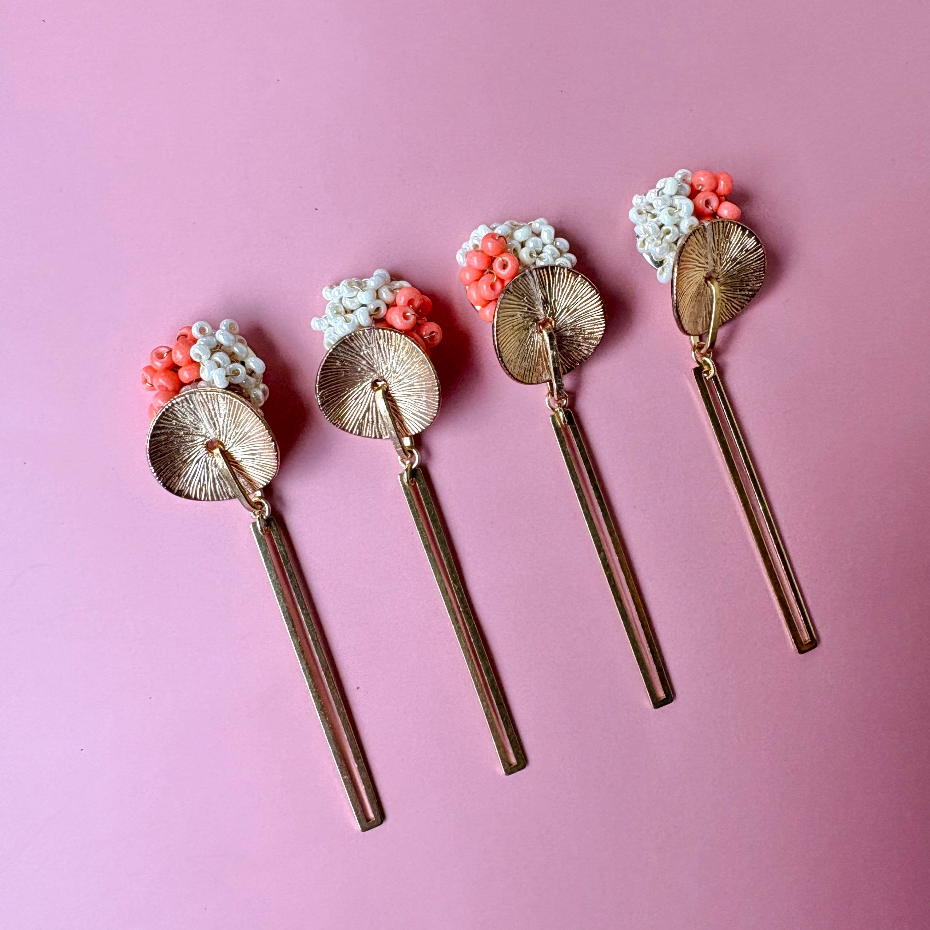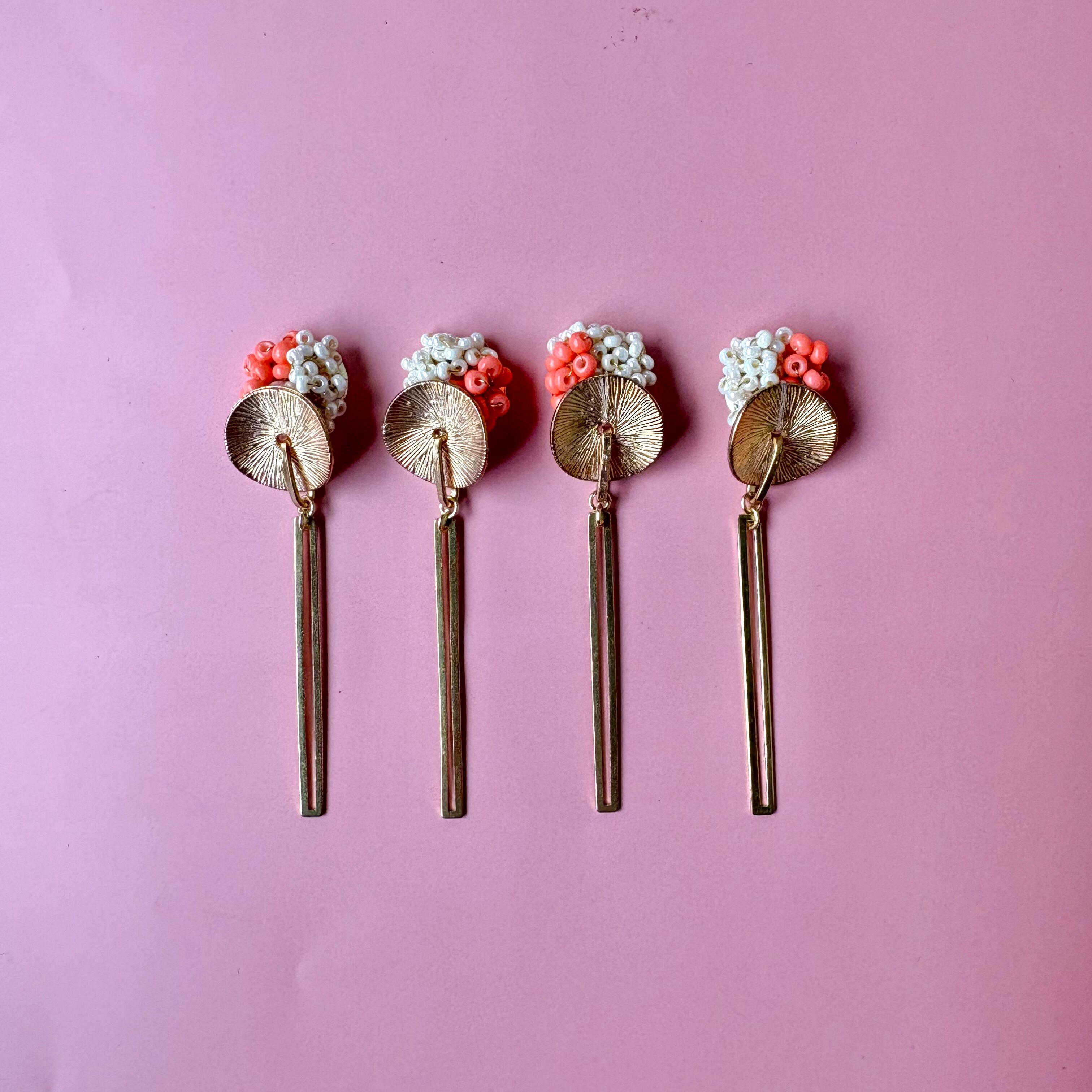 やわらかなコーラルとホワイトの粒に、きらりと光るゴールドパーツを合わせて、甘さと大人っぽさのバランスを大切に仕上げました。