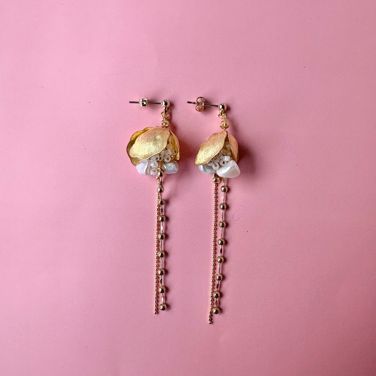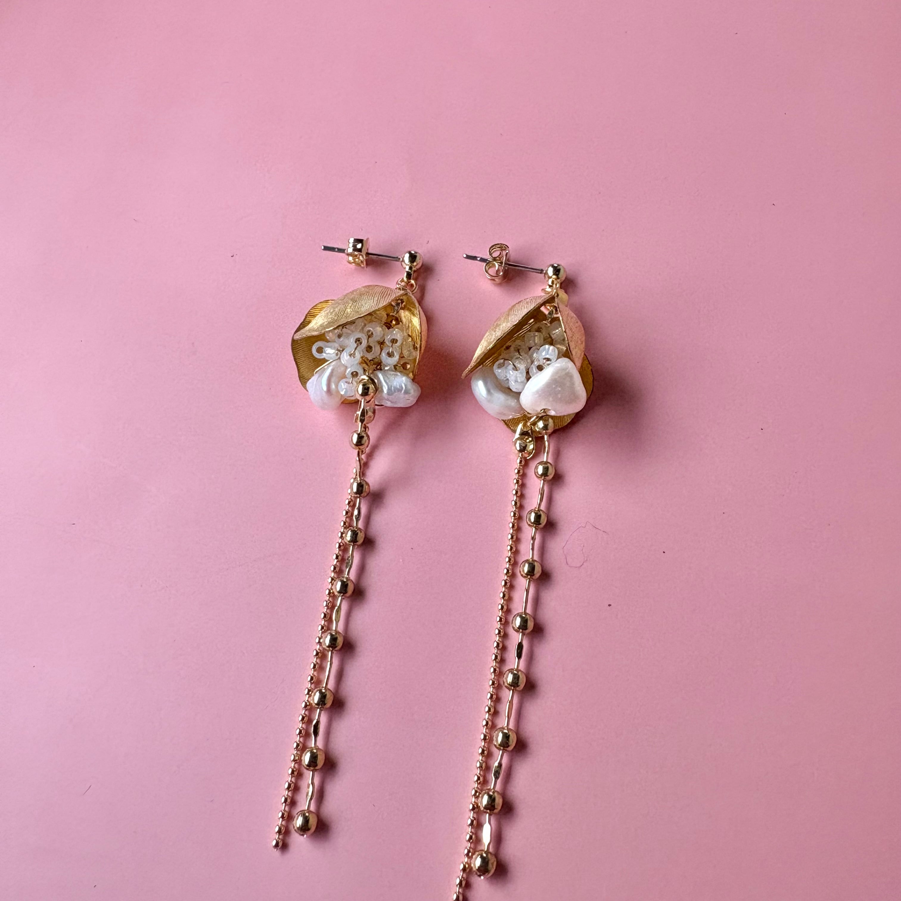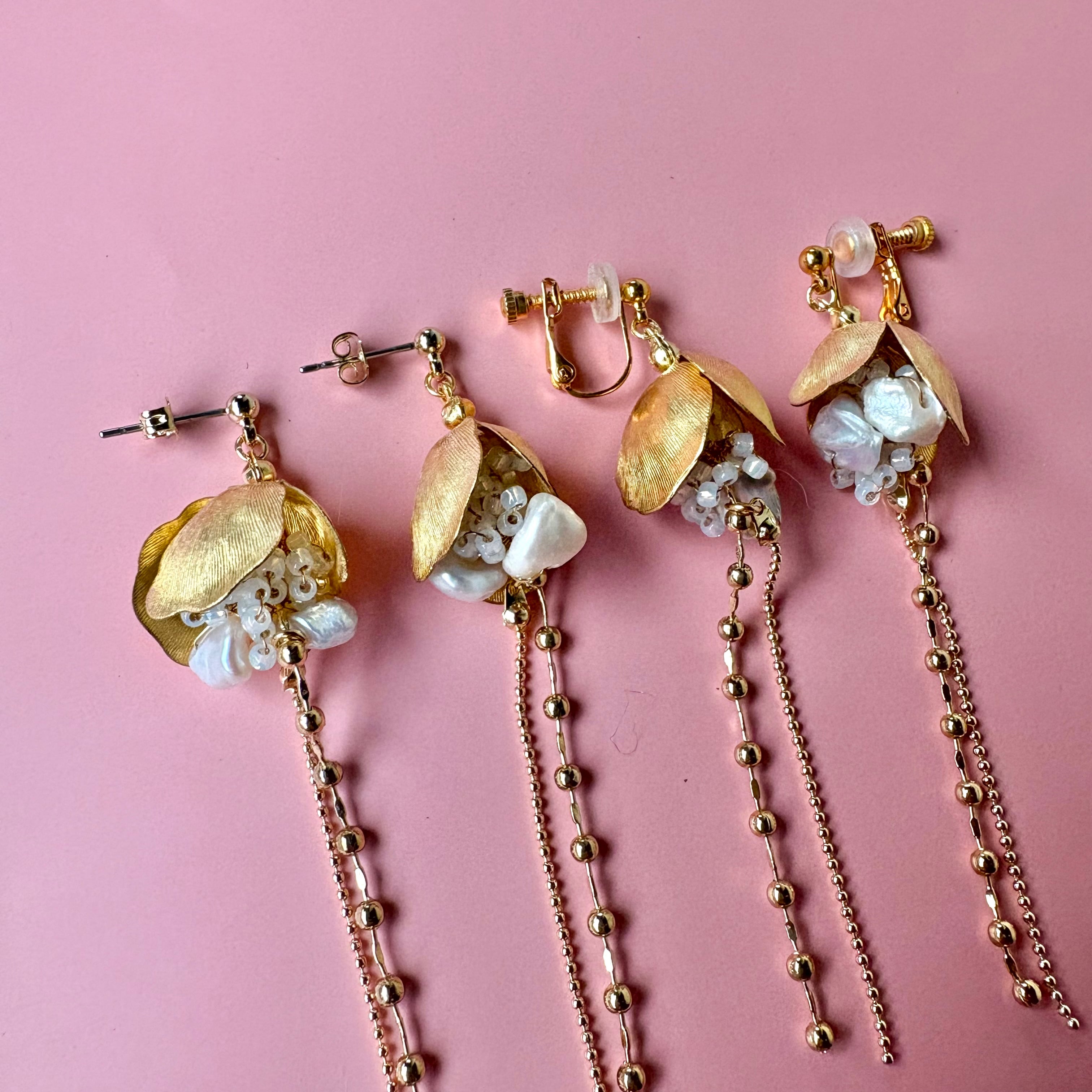 やわらかなパールカラービーズの粒に、きらりと光るゴールドパーツを合わせて、甘さと大人っぽさのバランスを大切に仕上げました。